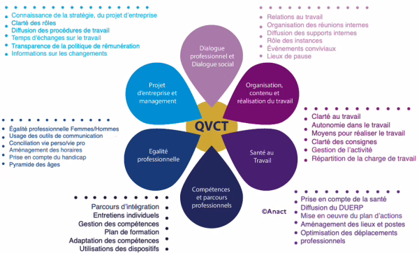Fondé sur le modèle de l’ANACT ou bien celui du BNQ (selon vos objectifs) , notre accompagnement à la QVCT est bien entendu à 360° sur l’ensemble des composantes que sont : Contenu du travail / Santé au travail  / Compétences & Parcours professionnel / Égalité professionnelle / Management / Relations au travail et Climat Social.